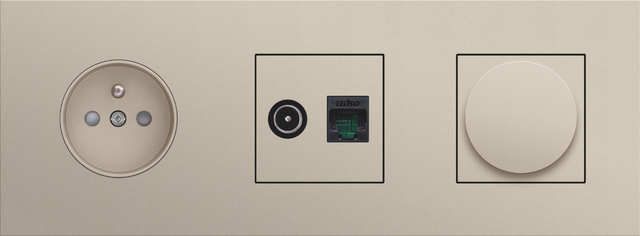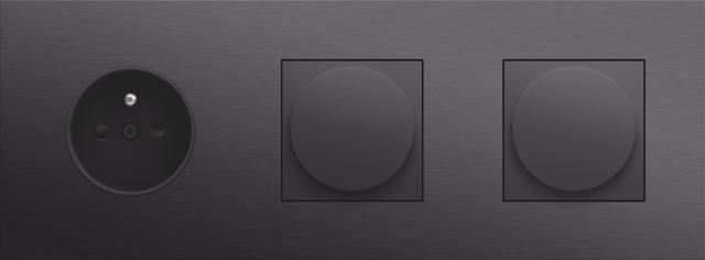 Finishing set for a socket outlet with pin earthing and shutters. This central plate must be used with a socket outlet with a flush-mounting depth of 28.5 mm and a Niko Rocker or Niko Toggle socket outlet faceplate. The finishing set has a black screw and black shutters that blend with the rest of the finishing set. Finishing colour: anthracite coated.