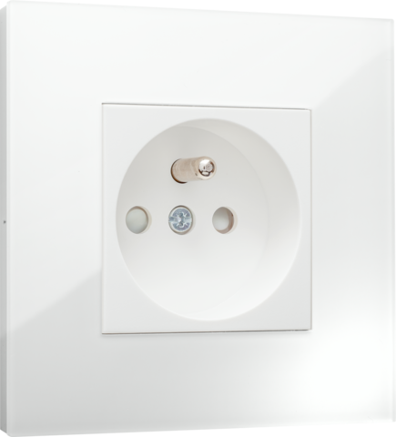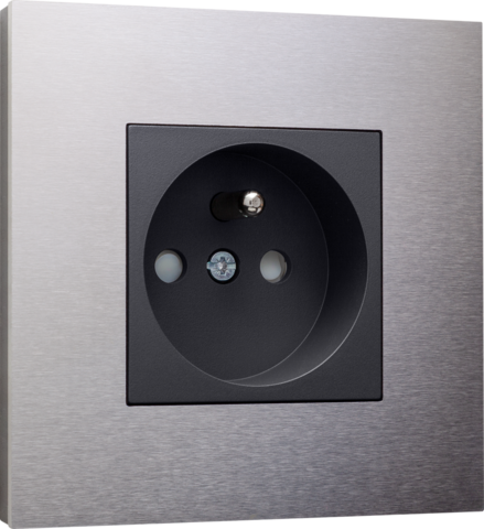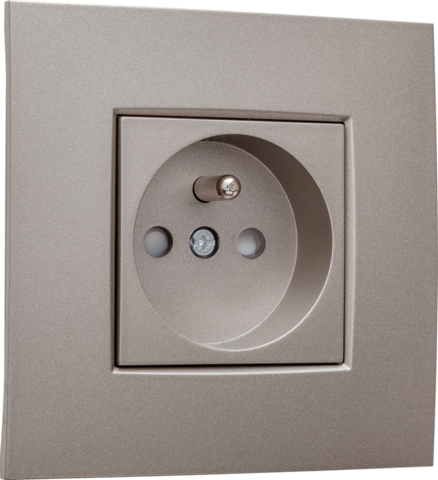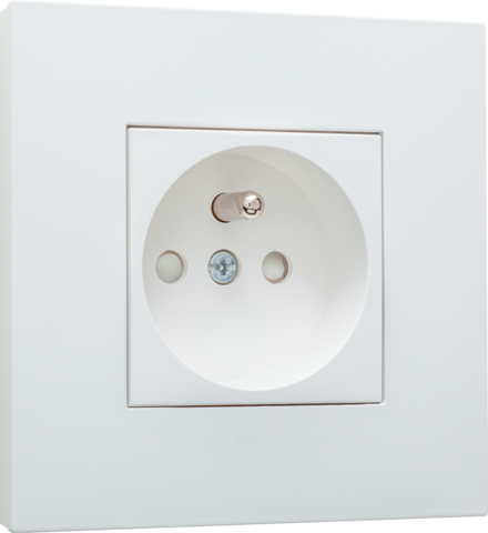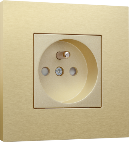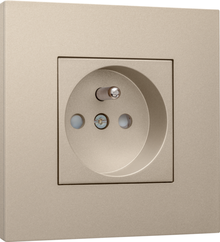 Finishing set for socket outlet with pin earthing and shutters, flush-mounting depth 28.5 mm, cream. This central plate is surrounded with a flat edge that is equipped at all 4 corners with a rectangular opening, each containing a multi-positional snap hook. The construction of the central plate ensures that the faceplate can always be attached flat to the wall, even in cases of untidy plasterwork. This works in two directions: If the flush-mounting box sticks out of the plasterwork, the multi-positional snap hooks can compensate for a 1 to 1.2 mm margin; if the flush-mounting box is sunk too deeply in the plasterwork, the snap hooks can compensate for up to a 1.8 mm margin. The flat edge around the central plate also has 4 round openings that ensure the correct positioning of the faceplate in relation to the central plate. After mounting all components (faceplate, finishing set and switch), no metal parts are visible thanks to the flat edge of the central plate.