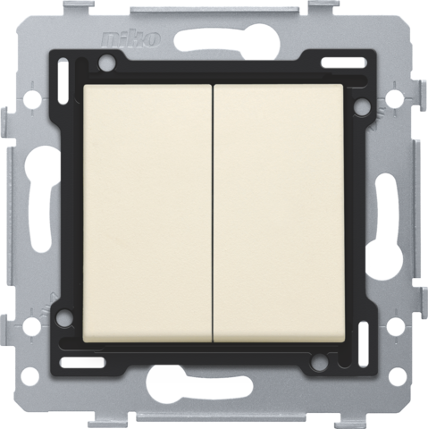 Finishing set for two-circuit switch, two-way switch + N.O. push button, double two-way switch or double N.O. or N.C. push button, anthracite coated. This central plate is surrounded with a flat edge that is equipped at all 4 corners with a rectangular opening, each containing a multi-positional snap hook. The construction of the central plate ensures that the faceplate can always be attached flat to the wall, even in cases of untidy plasterwork. This works in two directions: If the flush-mounting box sticks out of the plasterwork, the multi-positional snap hooks can compensate for a 1 to 1.2 mm margin; if the flush-mounting box is sunk too deeply in the plasterwork, the snap hooks can compensate for up to a 1.8 mm margin. The flat edge around the central plate also has 4 round openings that ensure the correct positioning of the faceplate in relation to the central plate. After mounting all components (faceplate, finishing set and switch), no metal parts are visible thanks to the flat edge of the central plate.