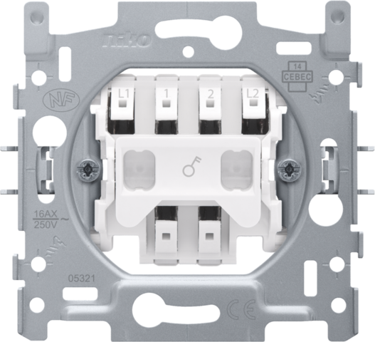 Compound double-pole control switch (base and finishing set). The base is equipped with screw terminals and claw fixing. There is a lens on the switch that can work with an LED module in various colours. Finishing colour: cream