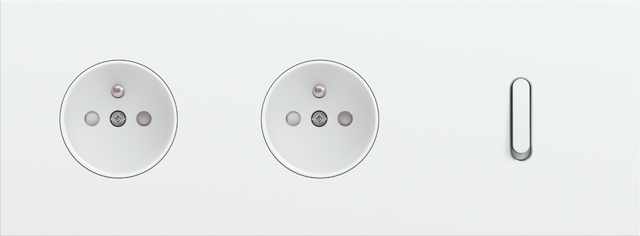 The Niko Rocker threefold horizontally oriented faceplateclicks onto two socket outlets and a single switch function that have been vertically installed on top of each other with a centre distance of 71 mm. The faceplate combines with any available Niko Rocker and Niko Toggle socket outlet finishing set and a Niko Rocker single switch function. The faceplate combines with any available Niko Rocker and Niko Toggle socket outlet finishing set and a Niko Rocker single switch function. It consists of an upper frame, light guide and lower frame that are mechanically interconnected. The upper frame is made of steel. The lower frame is made of white polycarbonate (PC) + acrylic-styrene-acrylate (ASA), white coated. The upper frame is 2 mm thick and the lower frame 6 mm.