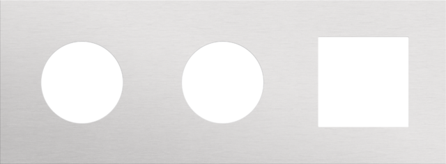 The Niko Rocker and Niko Toggle threefold horizontally oriented faceplate clicks onto two socket outlets and one 45 x 45 mm function that have been horizontally installed next to each other with a centre distance of 71 mm. The faceplate combines with any available Niko Rocker and Niko Toggle socket outlet finishing set and Niko 45 x 45 mm function. It consists of an upper frame, light guide and lower frame that are mechanically interconnected. The upper frame is made of brushed aluminium. The lower frame is made of dark grey polycarbonate (PC) + acrylic-styrene-acrylate (ASA). The upper frame is 6 mm thick and the lower frame 2 mm.