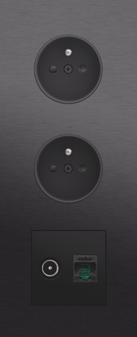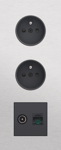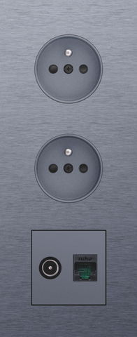 Finishing set for a socket outlet with pin earthing and shutters. This central plate must be used with a socket outlet with a flush-mounting depth of 28.5 mm and a Niko Rocker or Niko Toggle socket outlet faceplate. The finishing set has a black screw and black shutters that blend with the rest of the finishing set. Finishing colour: anthracite coated.
