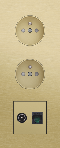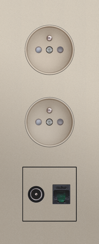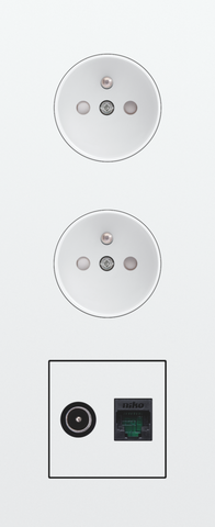 The Niko Rocker and Niko Toggle threefold vertically oriented faceplate clicks onto two socket outlets and one 45 x 45 mm function that have been vertically installed on top of each other with a centre distance of 60 mm. The faceplate combines with any available Niko Rocker and Niko Toggle socket outlet finishing set and Niko 45 x 45 mm function. It consists of an upper frame, light guide and lower frame that are mechanically interconnected. The upper frame is made of steel. The lower frame is made of white polycarbonate (PC) + acrylic-styrene-acrylate (ASA), white coated. The upper frame is 2 mm thick and the lower frame 6 mm.
