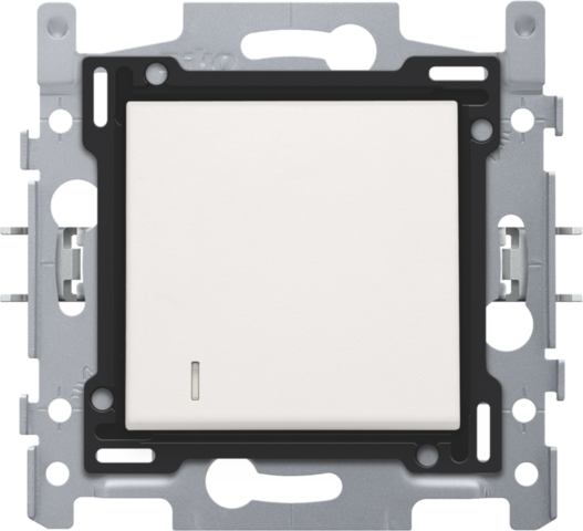 Compound two-way control switch (base and finishing set). The base is equipped with screw terminals and claw fixing. There is a lens on the switch that can work with an LED module in various colours. Finishing colour: white