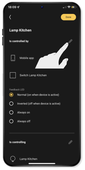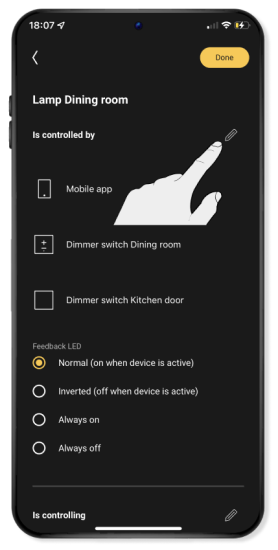 The app now displays a list with the switches that command this lamp. Click again on the pencil beside Is controlled by.