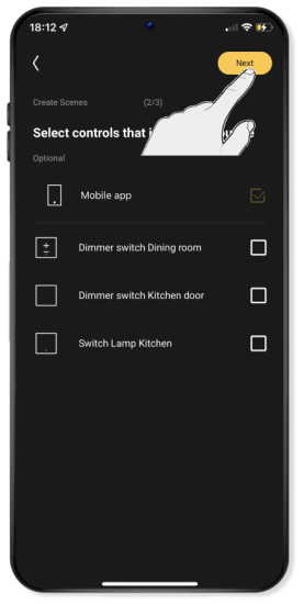 You can choose a switch or dimmer with which to command this scene or you can opt to do it using the app alone.