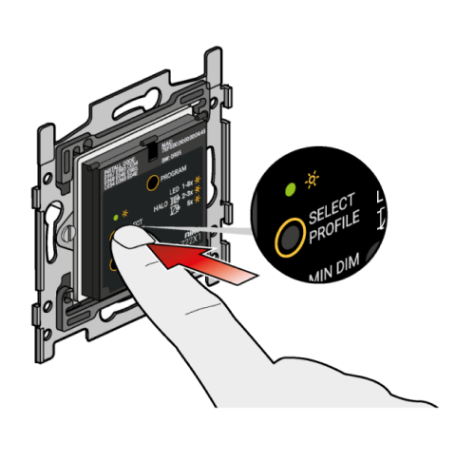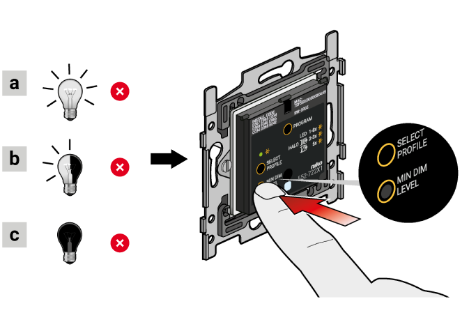 Note: The dimming profile of the connected dimmer is set by default to profile 5. In most cases these standard settings are sufficient. If you are not completely happy with the minimum dimming level or if you notice that the lamp flickers, follow these steps.