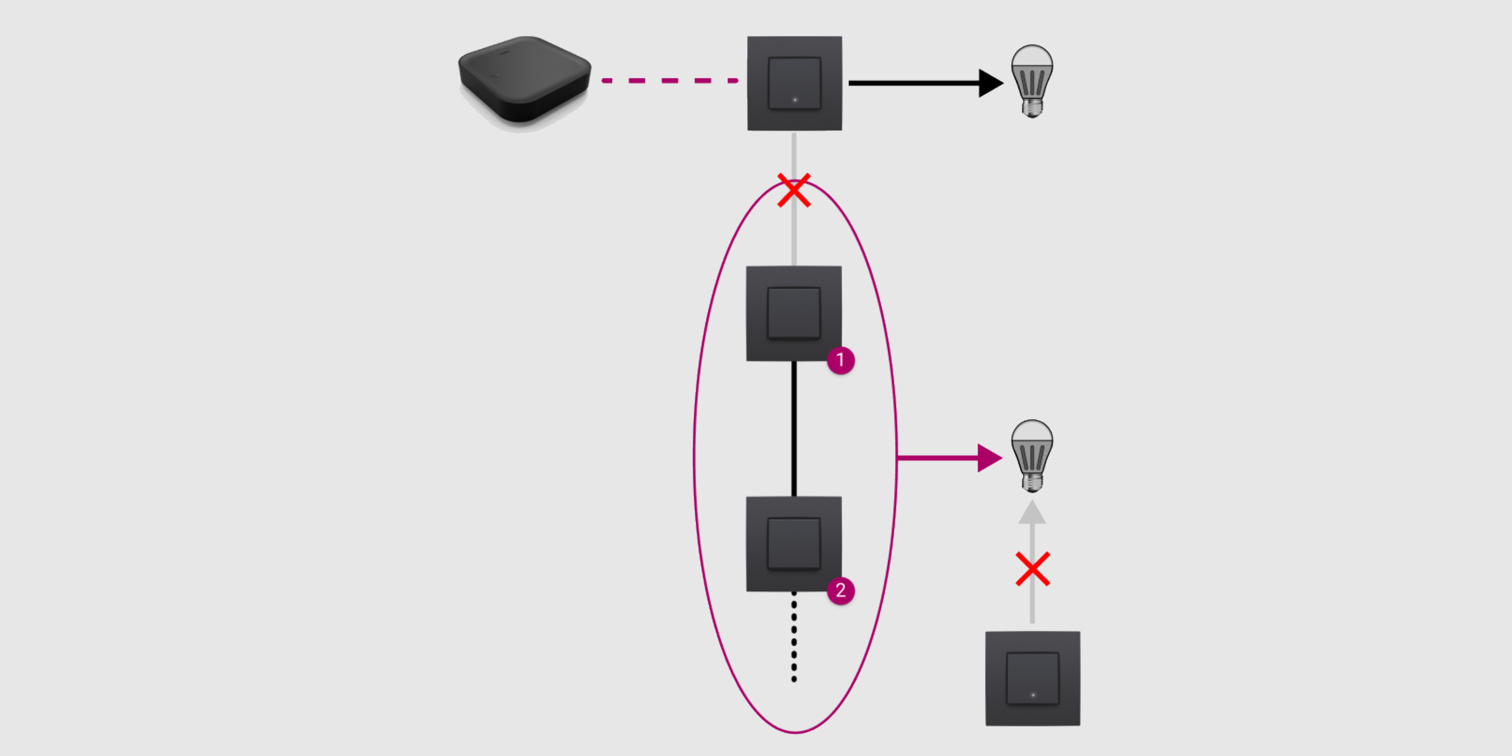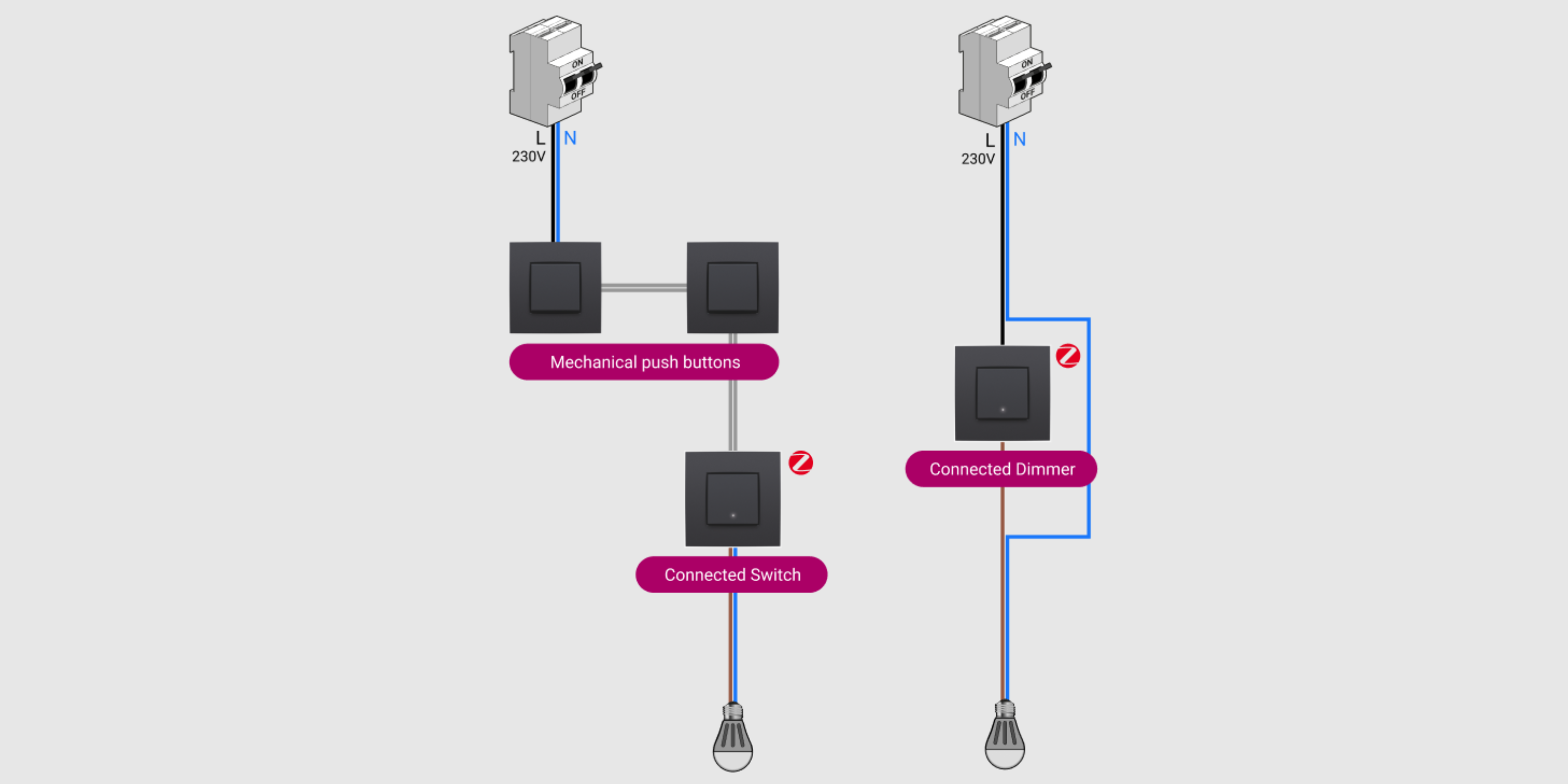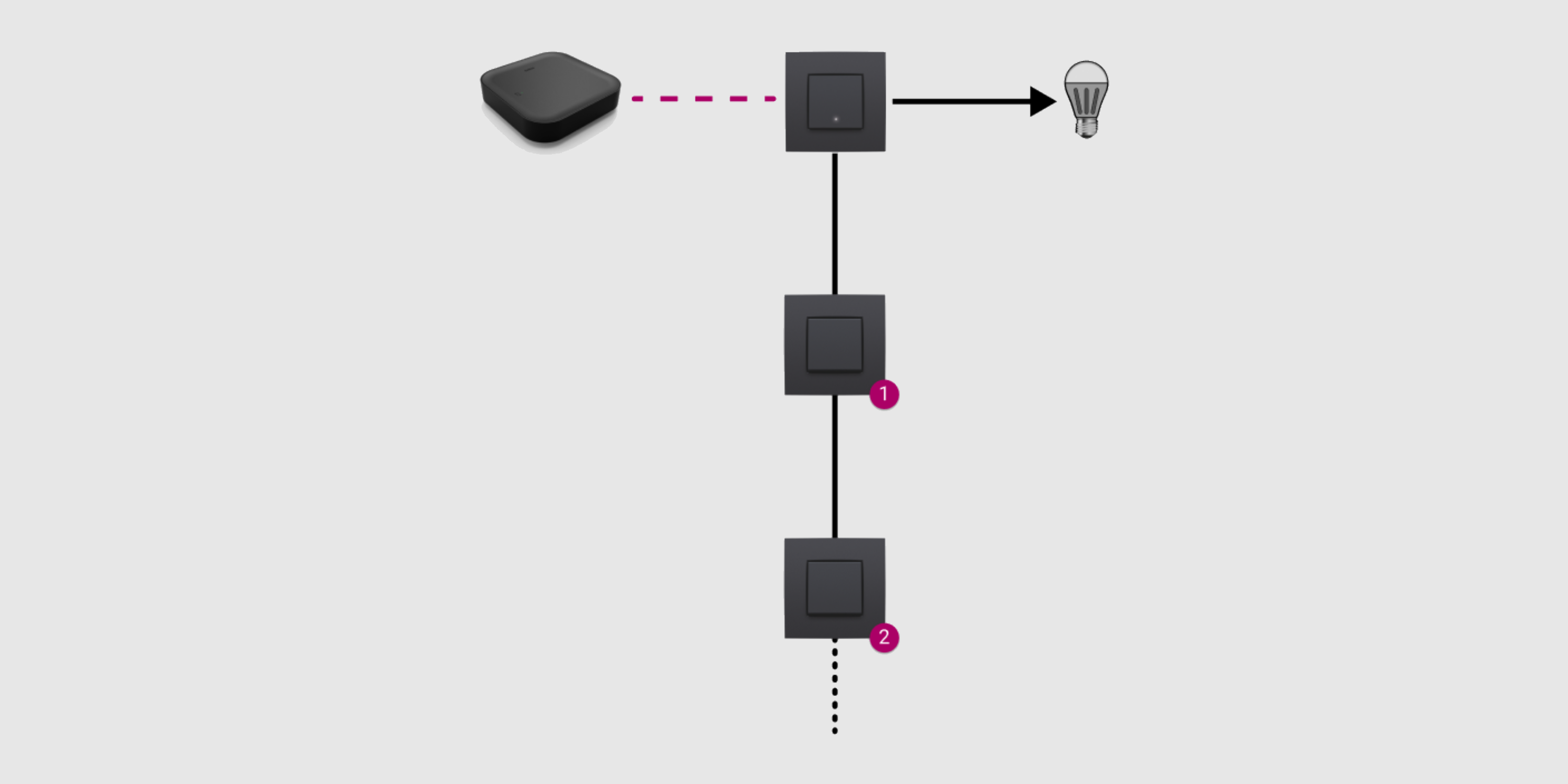 - To each light point (one or more lamps that are commanded together), you can connect only one connected switch or dimmer. For a light point with several control points, replace the switch that is directly connected with the lamp with a connected switch or dimmer. Replace the other switches with traditional push buttons.