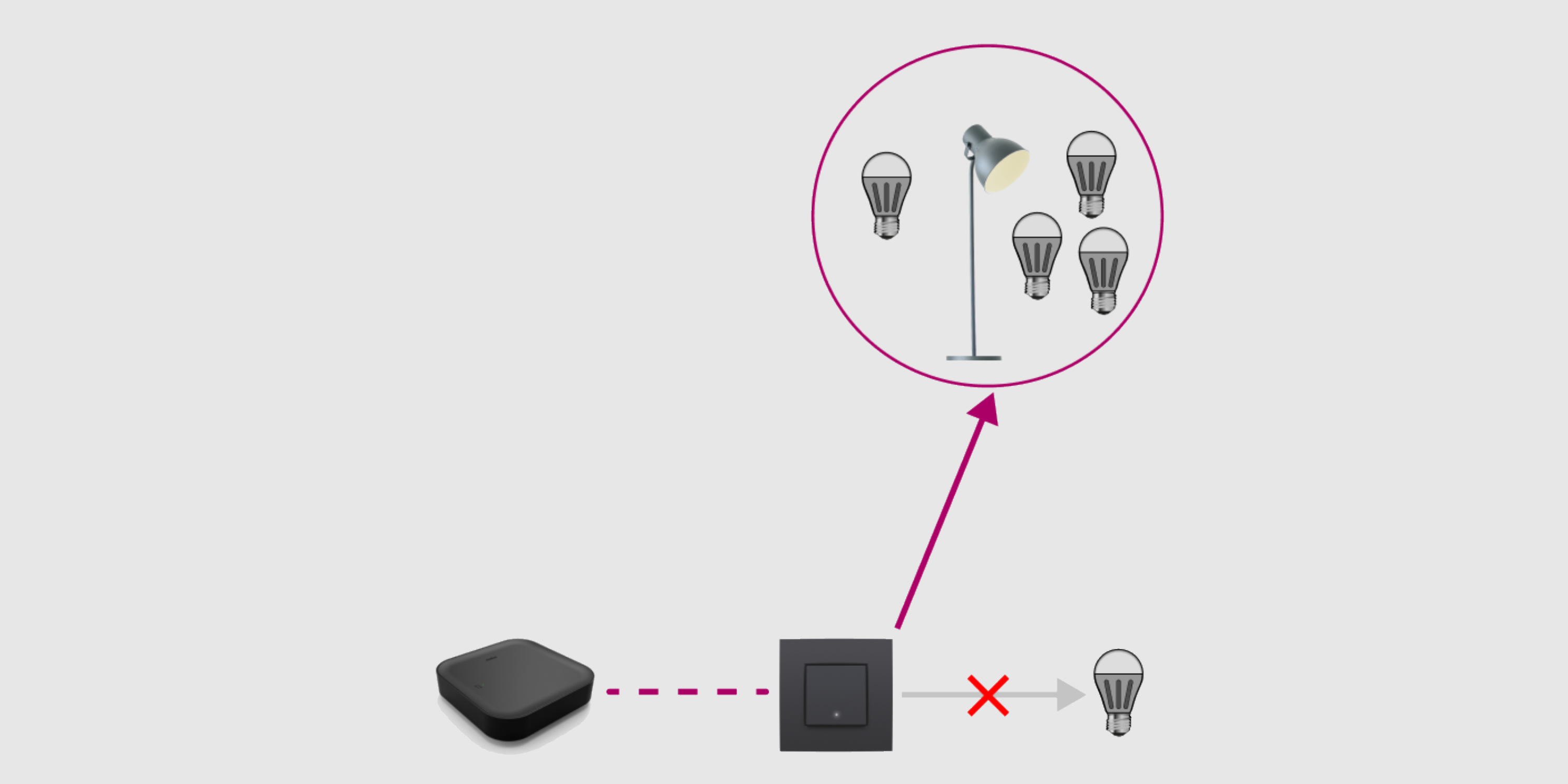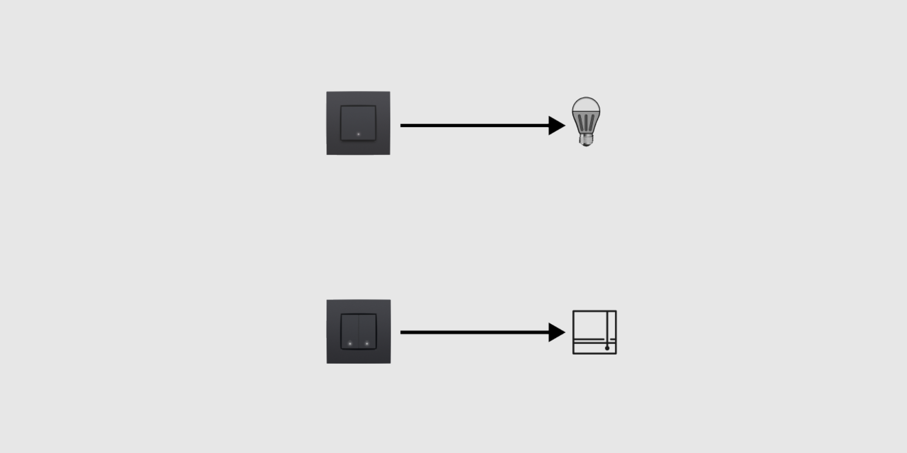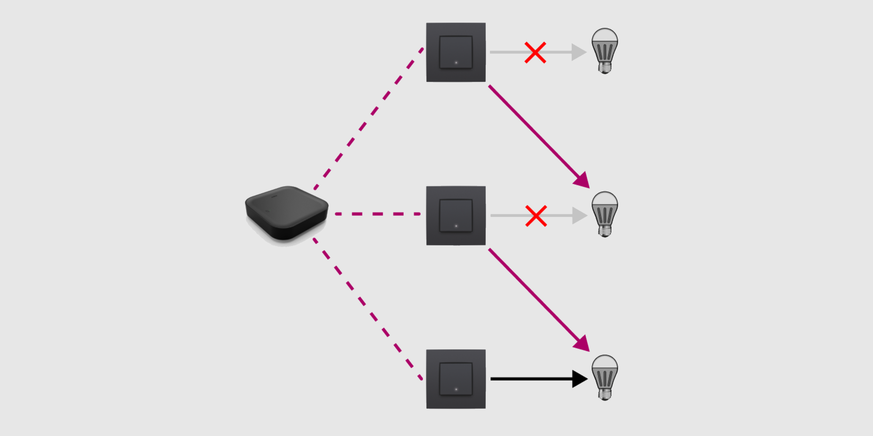 - To each light point (one or more lamps that are commanded together), you can connect only one connected switch or dimmer. For a light point with several control points, replace the switch that is directly connected with the lamp with a connected switch or dimmer. Replace the other switches with traditional push buttons.