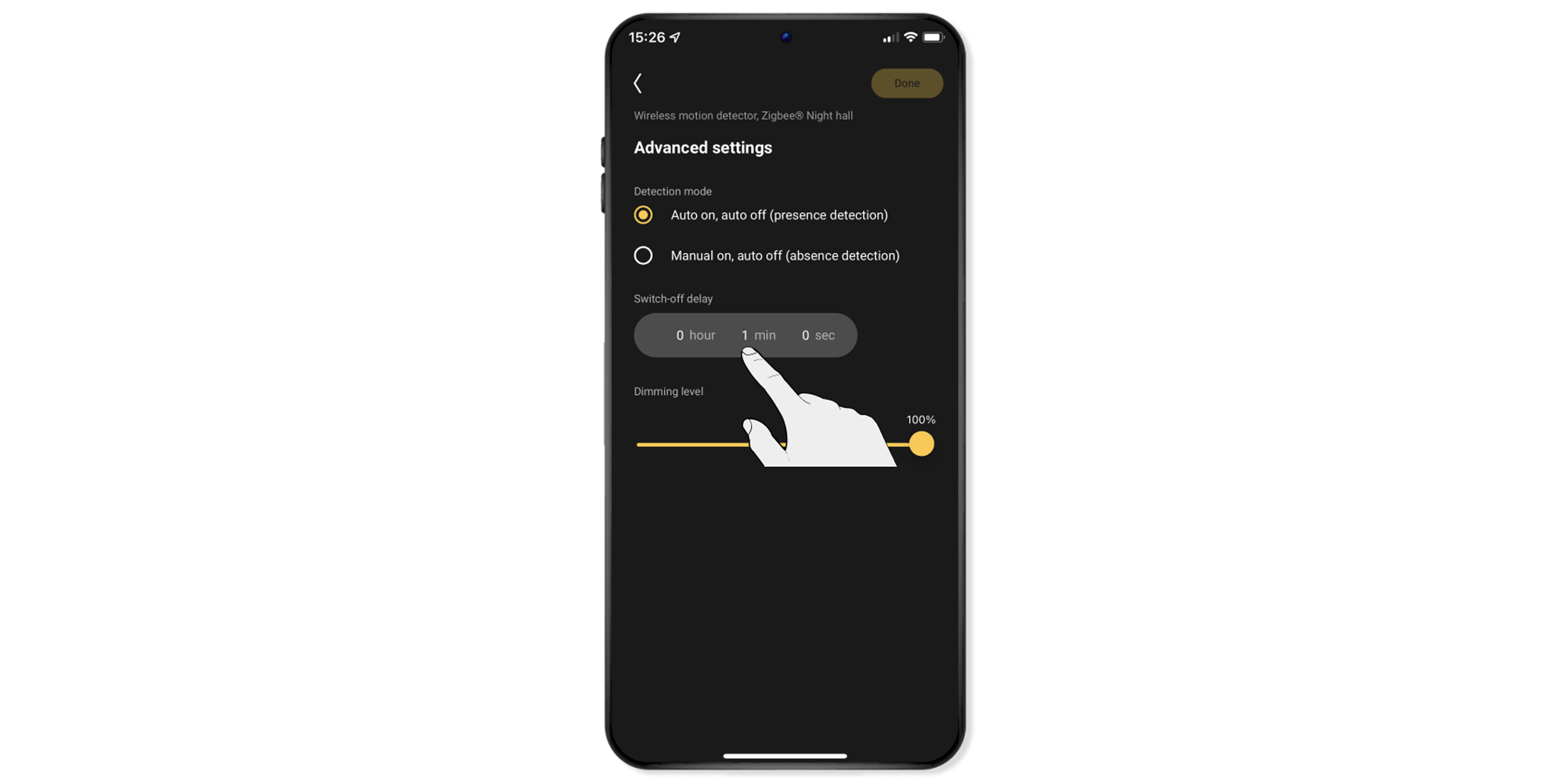 The switch-off delay is the time after the last detected motion after which the lamps and devices switch off automatically. This is set to 1 minute by default.