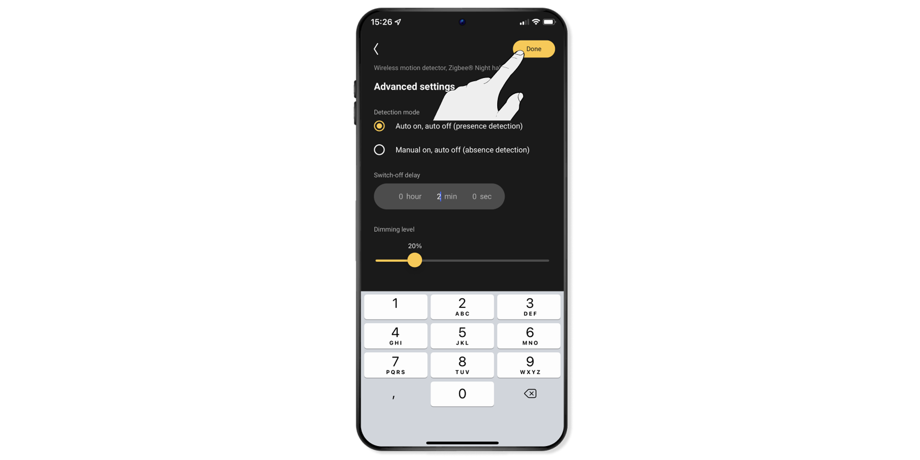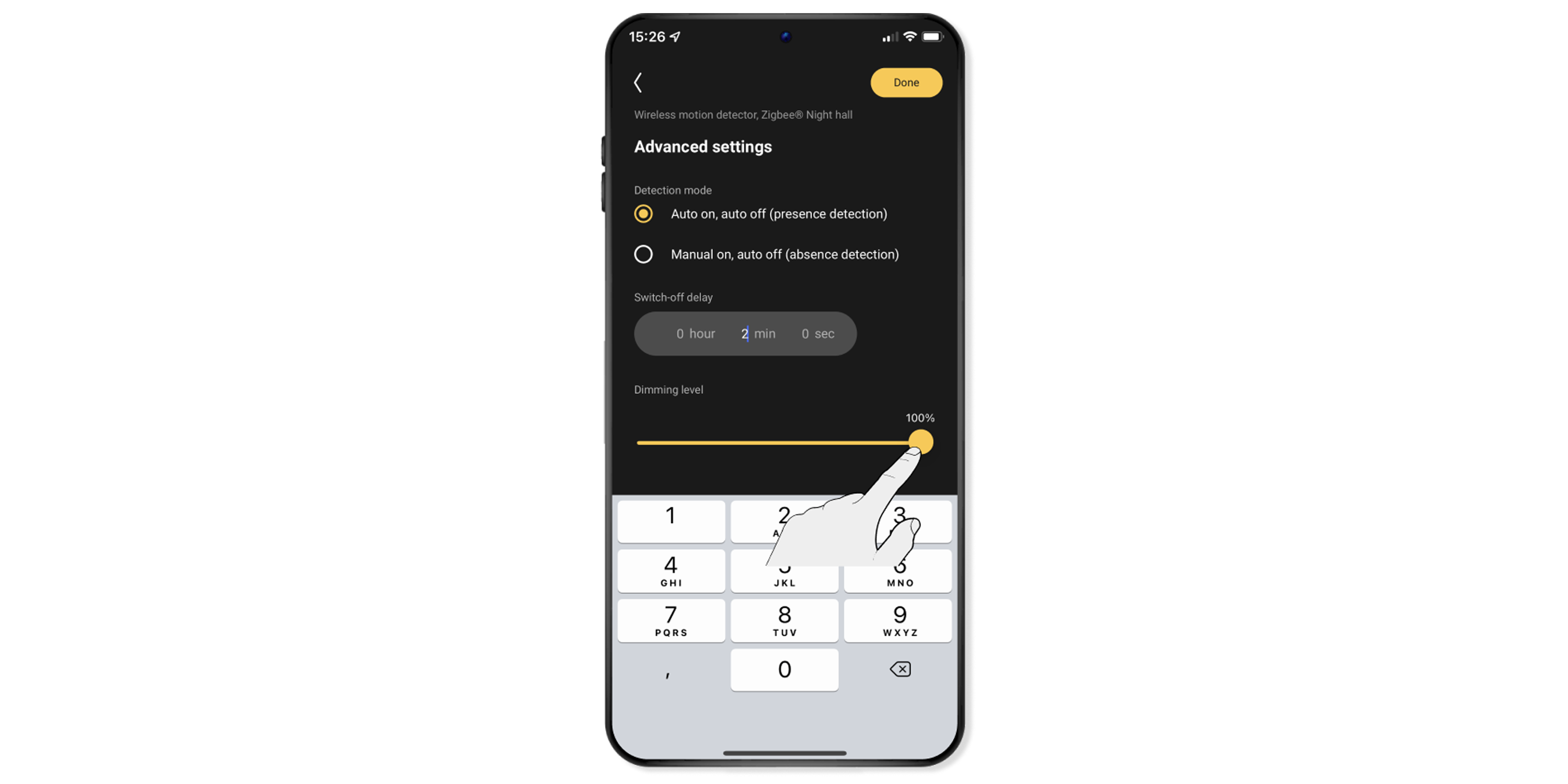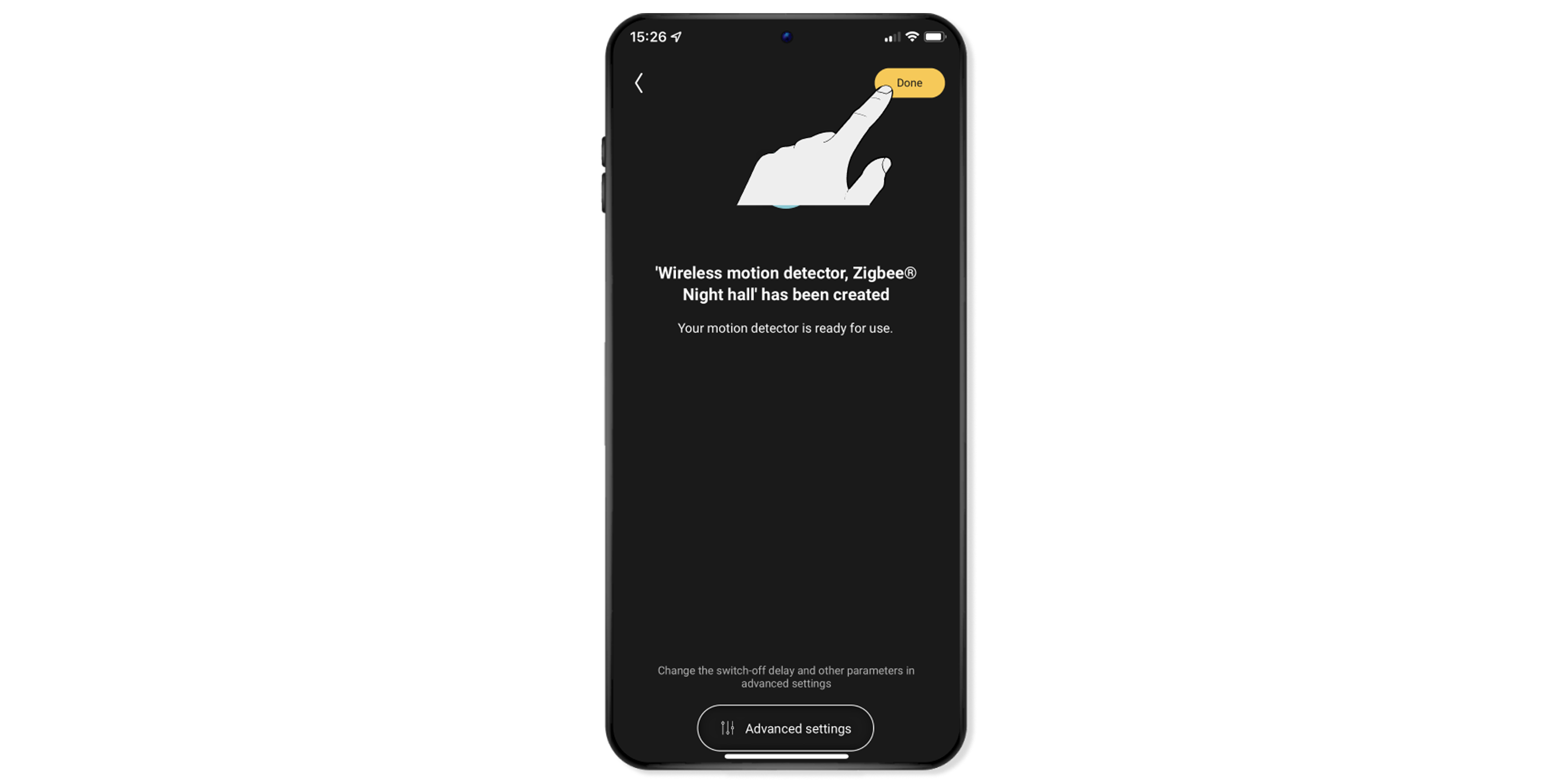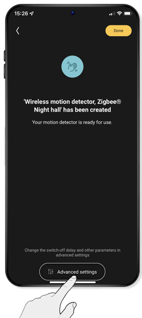 Please note: You can switch off the lights and devices manually in the app at any time after they have been switched on by the motion detector. So you don't have to wait until the set time has elapsed.