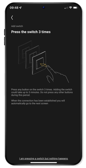 Press the dimmer button in the middle of the dimmer briefly 3 times in order to send a signal to the Niko Home app, so that you can add the dimmer.