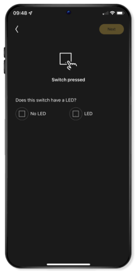 After pressing the small dim button 3 times, the blue LED on the dimmer will flash. This can take 5 minutes. Once the connection has been made, the dimmer's blue LED will light up continuously for four seconds. You then go automatically to the next screen in the app.