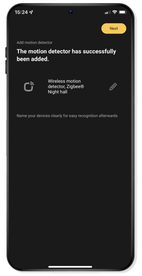 If this is not done automatically, you can also add the motion detector using the small button next to the battery. To do so, follow the instructions below.