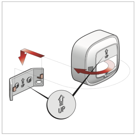 Slide the motion detector vertically into the brace on the wall so that the hooks drop into the recesses on each side of the motion detector.