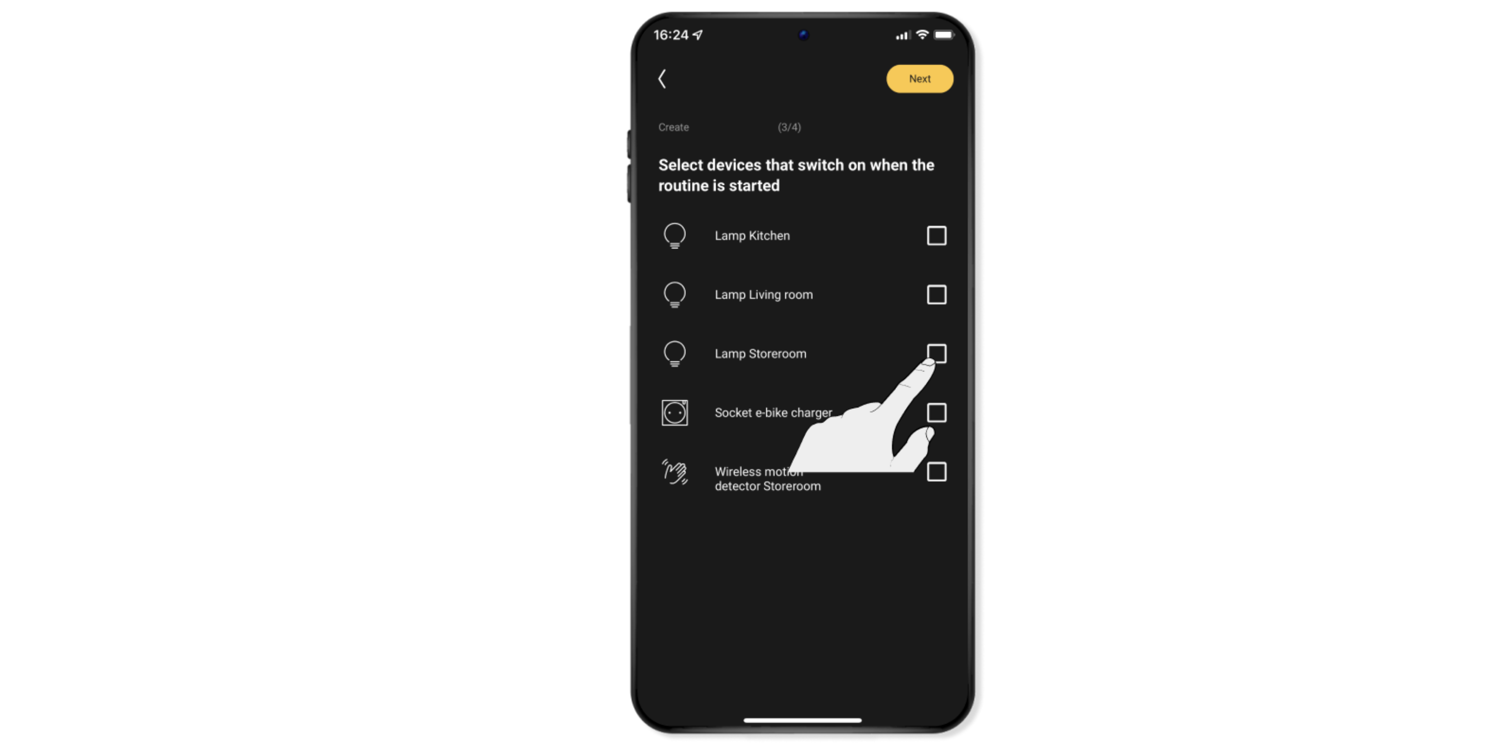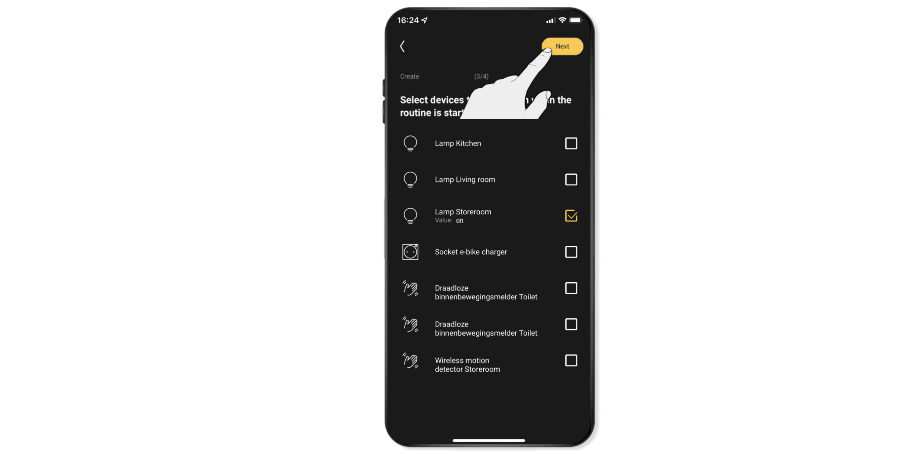 Select the lamps and devices that you want to switch on using motion detection and click on Continue.