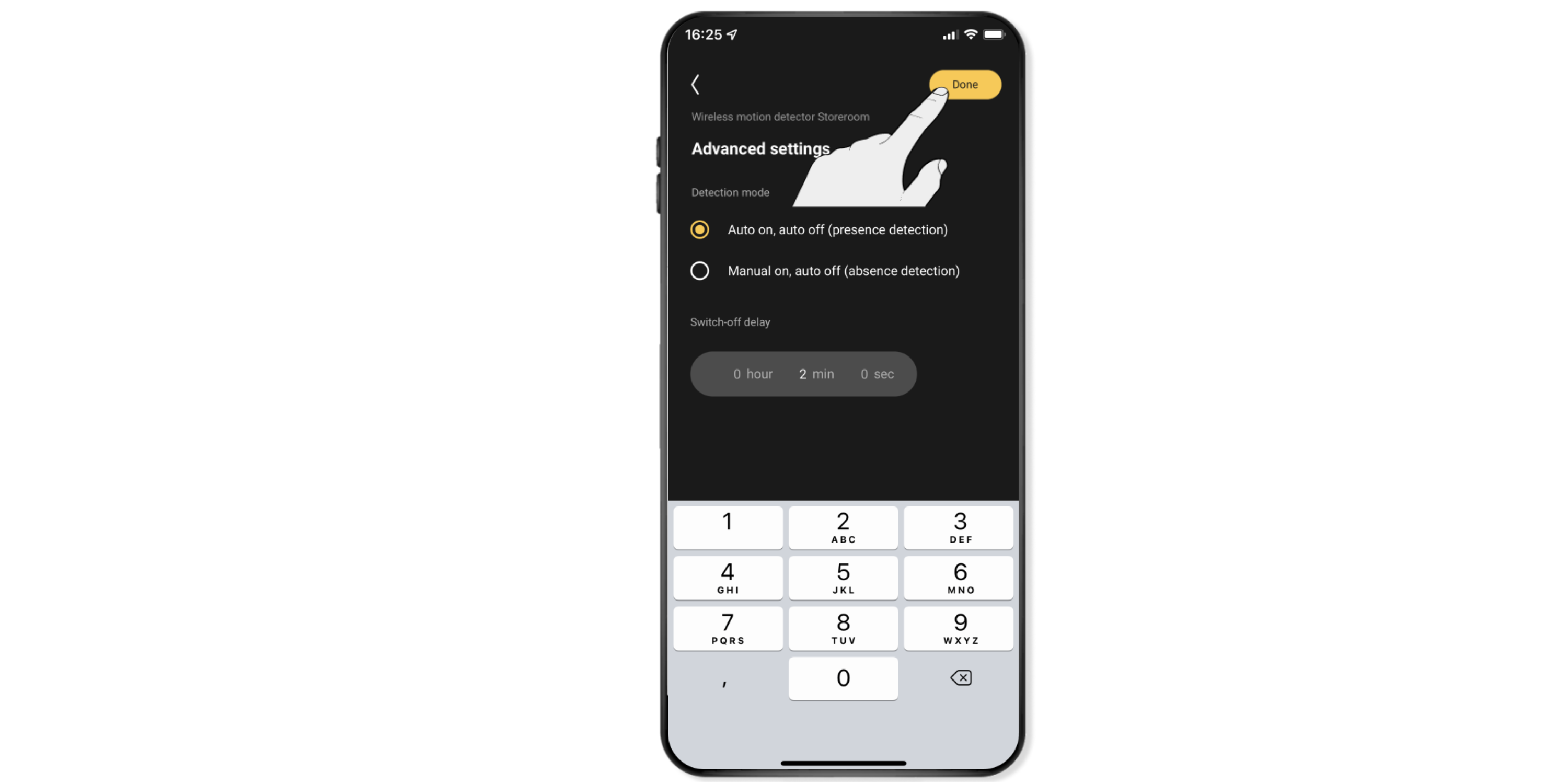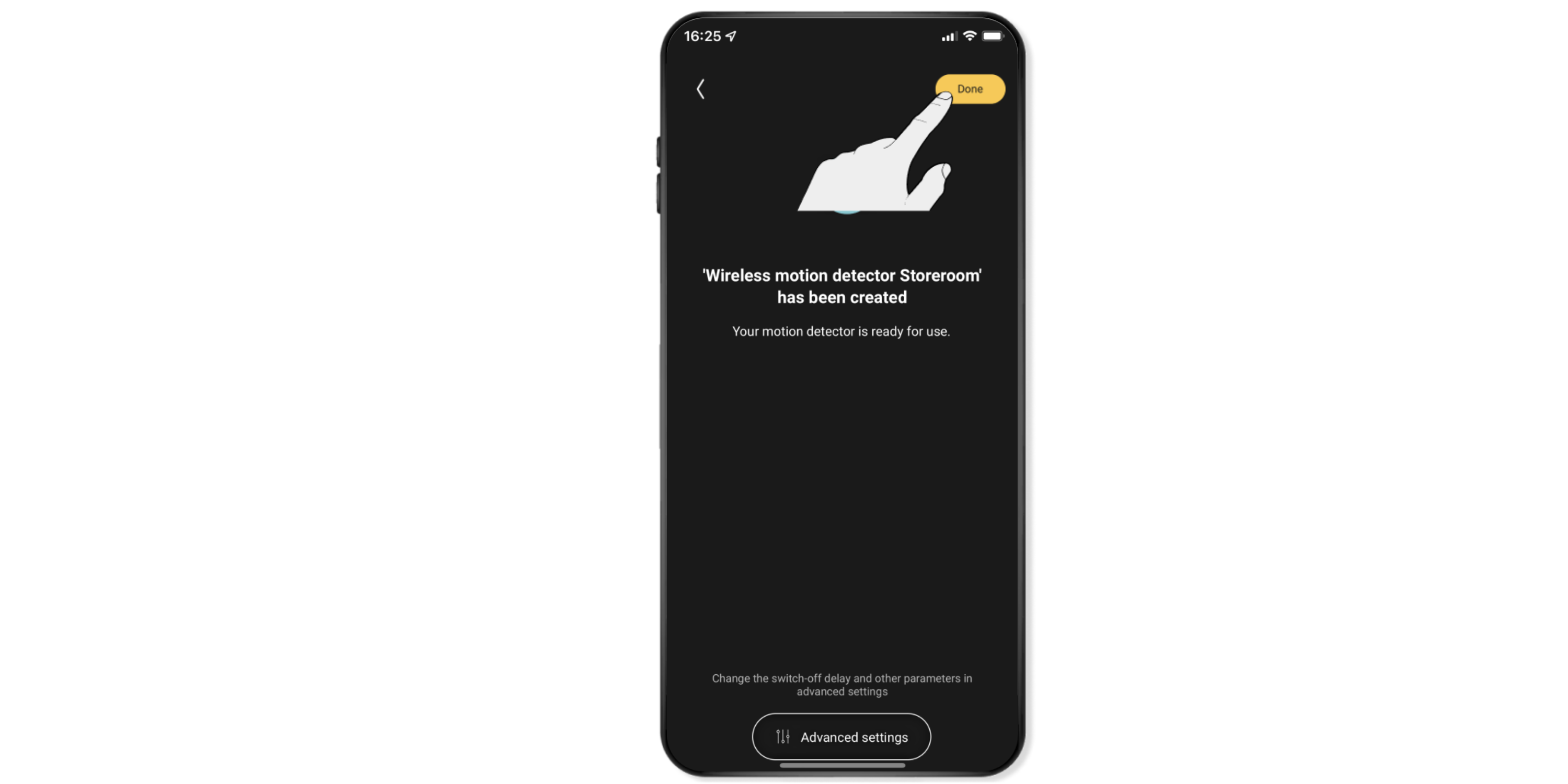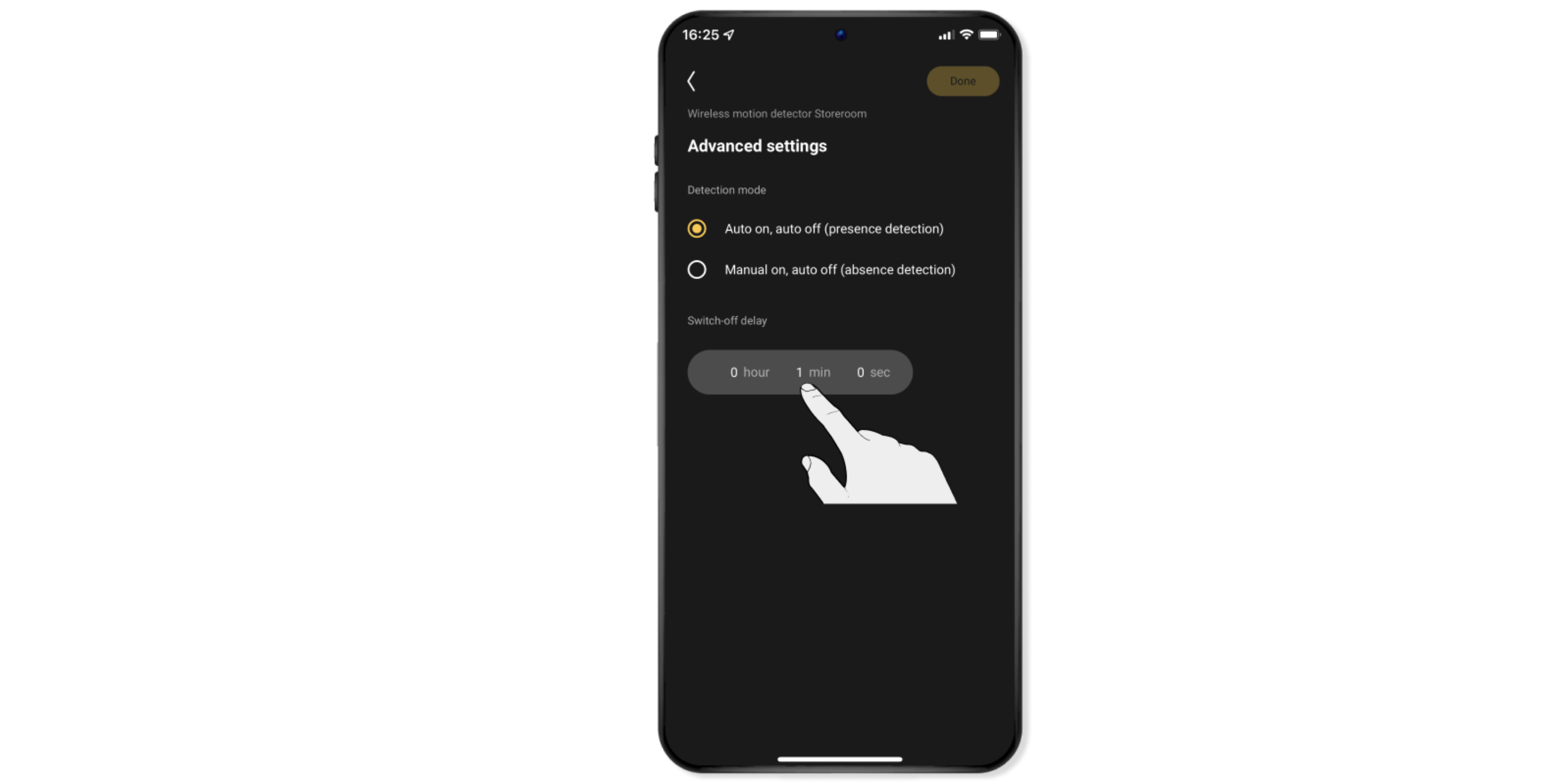 Note: You can also always use the app to switch off the lamps and devices manually after switching them on with the motion detector. Therefore, you are not obliged to wait until the set time has passed.