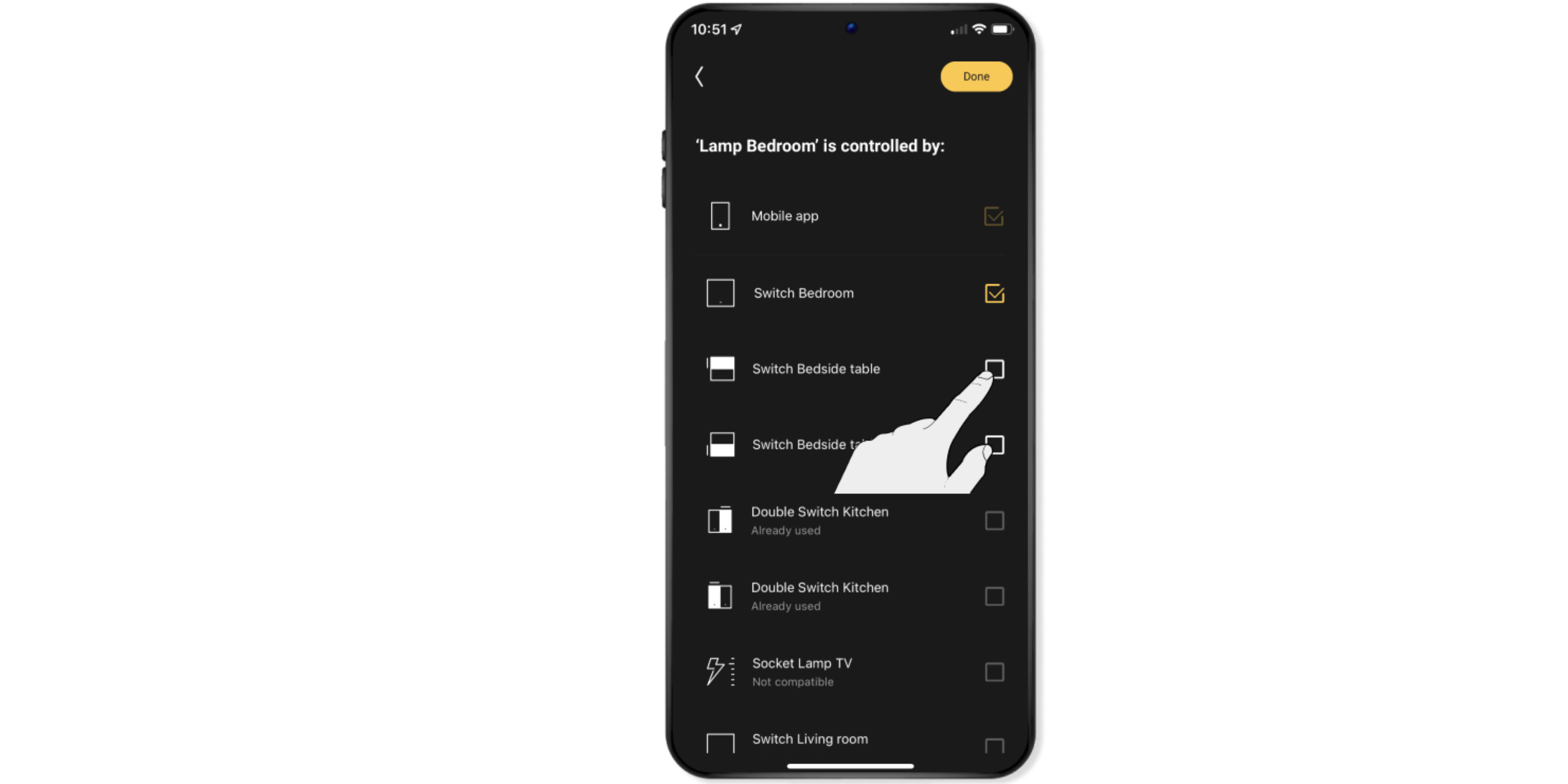 Once you have connected the switch with the app to your Niko Home Control installation, you can start programming. You can give each button a different function .