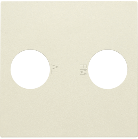 Enjoliveur avec 2 connexions coaxiales simples. La première entrée est destinée à une connexion EDU TV. La deuxième est destinée à une connexion FM. Les mots ‘TV’ et ‘FM’ sont gravés à côté des entrées. Couleur de finition: cream.