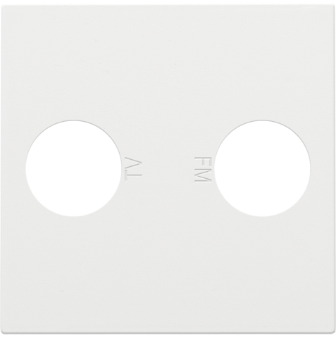 Enjoliveur avec 2 connexions coaxiales simples. La première entrée est destinée à une connexion EDU TV. La deuxième est destinée à une connexion FM. Les mots ‘TV’ et ‘FM’ sont gravés à côté des entrées. Couleur de finition: white coated.