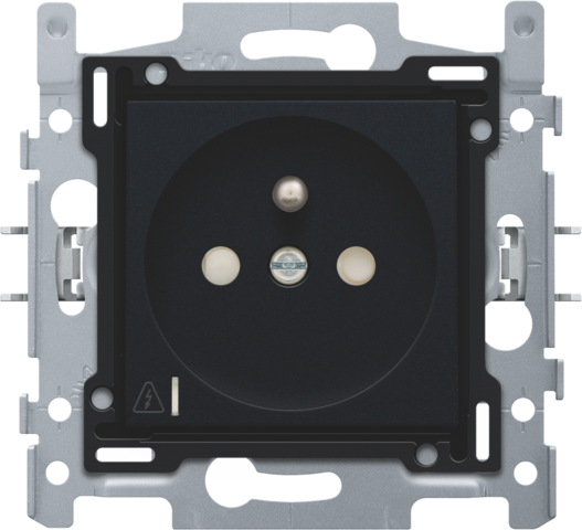 Appareil complet (mécanisme et set de finition) pour prise de courant avec protection contre les surtensions, broche de terre et obturateurs de protection. Cette prise possède une profondeur d’encastrement de 28,5mm. Couleur: black coated.