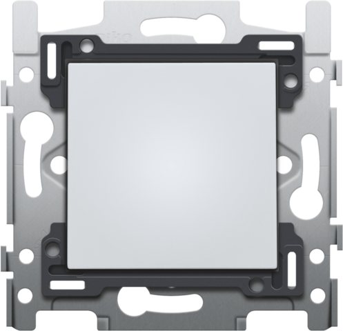 - Bord de montage: Le support d’encastrement est muni en haut et en bas d’un bord de montage en plastique gris foncé. Ce bord est réalisé en pc+asa et est joint au support d’encastrement par fusion. Les angles de ces deux bords de montage sont munis d’ouvertures rectangulaires (7,9 x 1,5 mm) dans chacune desquelles se trouve un crochet de sécurité multiposition. Les 4 ouvertures rectangulaires font en sorte qu’en cas de plafonnage peu soigneux, la plaque de recouvrement peut toujours être fixée bien à plat contre le mur grâce aux crochets de sécurité. Ce système fonctionne dans deux sens : si le boîtier d’encastrement dépasse du plâtrage, les crochets de sécurité multiposition compensent un jeu de 1 à 1,2 mm ; si le boîtier d’encastrement est enfoncé trop profondément dans le plâtrage, les crochets de sécurité peuvent compenser un jeu de 1,8 mm max. Les bords de montage sont également pourvus de 4 ouvertures rondes qui assurent le positionnement correct de la plaque de recouvrement par rapport à l’enjoliveur.