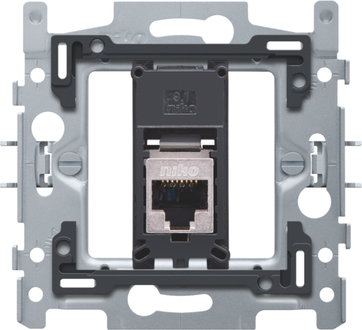 Ce mécanisme avec 1 prise RJ45 STP Cat. 6, en modèle plat, sert à établir une connexion réseau avec 1 appareil pour des applications de téléphonie, Ethernet, IP ou internet. Grâce à sa qualité supérieure, ce type permet en plus de transmettre des signaux de télédistribution pour des images TV analogiques, numériques et interactives. Le mécanisme est connecté en étoile sur l’armoire de connexion centrale à l’aide d’un câble du même type de performance. Le blindage permet à la connexion de mieux résister aux brouillages. Les dimensions intérieures du socle sont de 45 x 45 mm et ses dimensions extérieures de 60 x 71 mm et il est doté de fixation par griffes. Un set de finition d’une couleur au choix doit être commandé séparément.
