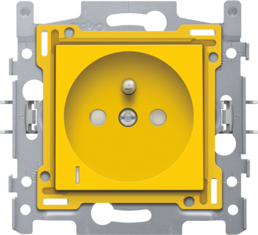 Prise de courant avec indication de tension, broche de terre et obturateurs de protection. Cette prise possède une profondeur d’encastrement de 28,5 mm et est munie de bornes automatiques et d’une fixation par griffes. Set de finition compris. Une plaque de recouvrement d’une couleur au choix doit être commandée séparément. Couleur de finition: yellow.