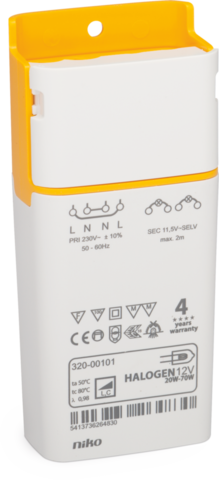 Ce transformateur électronique variable universel possède une puissance de 70 W. Il est utilisé pour le raccordement de charges basse tension (12 V) et est pourvu de bornes à vis tant du côté primaire que du côté secondaire. Deux charges peuvent être raccordées du côté secondaire tandis que du côté primaire, les deux entrées facilitent le repiquage (8x max.). Le capot clipsable facile à monter assure la décharge de traction. Le transformateur est très compact et se prête de ce fait particulièrement bien à une installation dans de petits espaces. Ce transformateur peut également être encastré dans des meubles. Il est pourvu d'un fusible thermique intégré et d’une protection intégrée contre les courts-circuits, les surcharges et les surchauffes. Ce transformateur possède un degré de protection IP20.