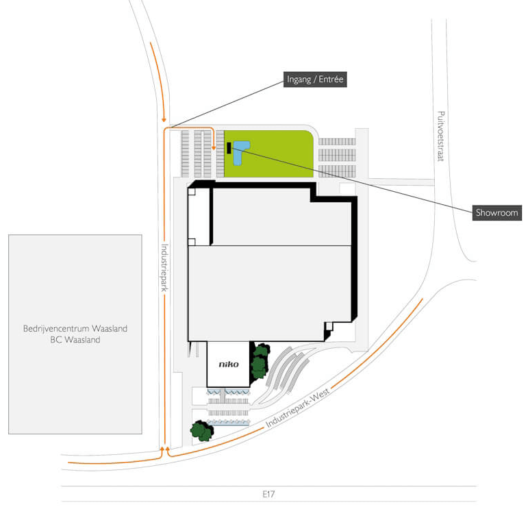 Le showroom se trouve sur le parking à l’arrière du bâtiment de Niko, Industriepark West 40, 9100 Sint-Niklaas (suivez les flèches).