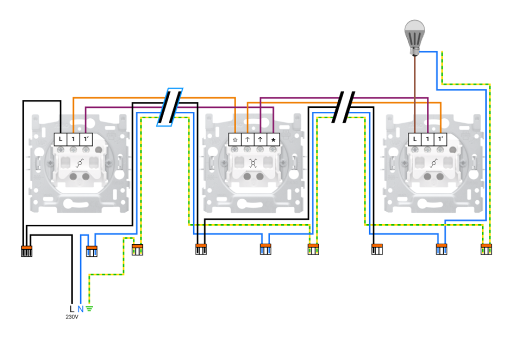 Le schéma de raccordement en exemple est une commutation permutateur avec trois points de commande. Pour chaque point de commande supplémentaire dans la commutation, un nouvel interrupteur permutateur est nécessaire. Les interrupteurs permutateurs se trouvent toujours au milieu, avec un interrupteur va-et-vient à chaque extrémité.