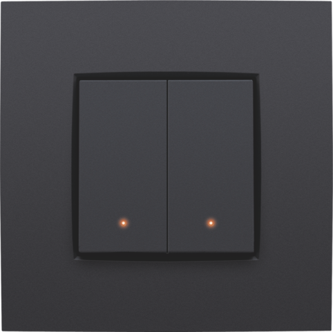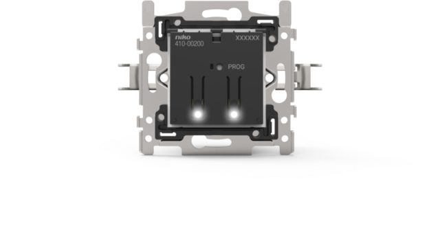 Mécanisme pour interrupteur intelligent double, avec fixation par griffes. Un set de finition et une plaque de recouvrement d’une couleur au choix doivent être commandés séparément.