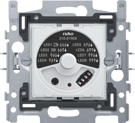 Cette commande rotative DALI est utilisée pour commander des armatures commandées par DALI. Le variateur peut être réglé de manière à commander séparément quinze groupes DALI ou, en mode diffusion, à contrôler simultanément tous les appareils commandés par DALI. Ce variateur n'est pas équipé d'une alimentation intégrée pour bus DALI (350-70985). Le variateur à bouton rotatif peut également être utilisé en association avec les détecteurs DALI adressables Niko de manière à diminuer manuellement l'intensité lumineuse. Il est possible de modifier manuellement la vitesse de variation (appelée « vitesse d'atténuation ») sans utiliser d'ordinateur.