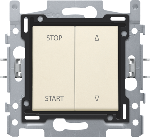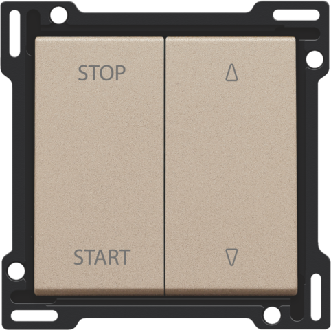 Set de finition pour interrupteur pour volets à verrouillage électrique, couleur champagne coated. L'enjoliveur est entouré d’un bord plat muni aux 4 angles d’une ouverture rectangulaire dans laquelle se trouve un crochet de sécurité multiposition. La partie saillante de l’enjoliveur fait en sorte qu’en cas de plâtrage peu soigneux, la plaque de recouvrement puisse toujours être fixée bien à plat contre le mur grâce aux crochets de sécurité. Ce système fonctionne dans deux sens : si le boîtier d’encastrement dépasse du plâtrage, les crochets de sécurité multiposition compensent un jeu de 1 à 1,2 mm ; si le boîtier d’encastrement est enfoncé trop profondément dans le plâtrage, les crochets de sécurité peuvent compenser un jeu de 1,8 mm max. Le bord plat qui entoure l’enjoliveur comprend également 4 ouvertures rondes qui assurent le positionnement correct de la plaque de recouvrement par rapport à l’enjoliveur. Après le montage de l’ensemble (plaque de recouvrement, set de finition et mécanisme), aucune partie métallique n’est visible grâce au bord plat sur l’enjoliveur.