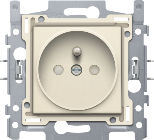 Set de finition pour prise de courant avec broche de terre et obturateurs de protection, profondeur d’encastrement de 21 mm, couleur blue grey coated. L'enjoliveur est entouré d’un bord plat muni aux 4 angles d’une ouverture rectangulaire dans laquelle se trouve un crochet de sécurité multiposition. La partie saillante de l’enjoliveur fait en sorte qu’en cas de plâtrage peu soigneux, la plaque de recouvrement puisse toujours être fixée bien à plat contre le mur grâce aux crochets de sécurité. Ce système fonctionne dans deux sens : si le boîtier d’encastrement dépasse du plâtrage, les crochets de sécurité multiposition compensent un jeu de 1 à 1,2 mm ; si le boîtier d’encastrement est enfoncé trop profondément dans le plâtrage, les crochets de sécurité peuvent compenser un jeu de 1,8 mm max. Le bord plat qui entoure l’enjoliveur comprend également 4 ouvertures rondes qui assurent le positionnement correct de la plaque de recouvrement par rapport à l’enjoliveur. Après le montage de l’ensemble (plaque de recouvrement, set de finition et mécanisme), aucune partie métallique n’est visible grâce au bord plat sur l’enjoliveur.
