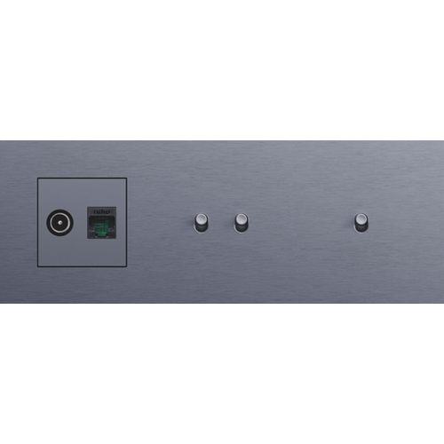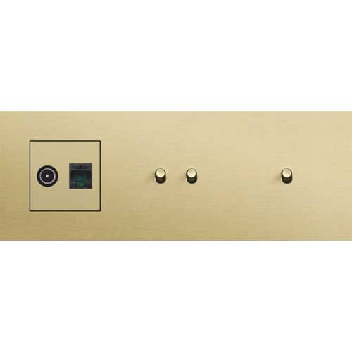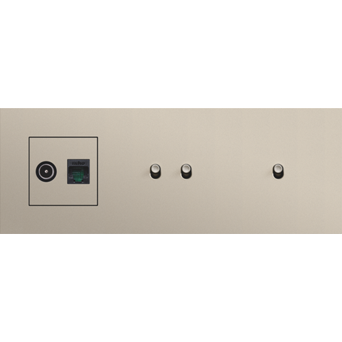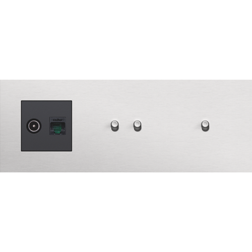 La plaque de recouvrement triple Niko Toggle, horizontale, s'enclenche sur une fonction de 45 x 45 mm, une fonction de commutation double et une fonction de commutation simple that have been horizontally installed next to each other with a centre distance of 71 mm. La plaque de recouvrement se combine avec tout set de finition Niko 45 x 45 mm et Niko Toggle disponibles pour les fonctions de commutation simple et double. Elle se compose d'un cadre supérieur, d'un guide lumineux et d'un cadre inférieur qui sont interconnectés mécaniquement. Le cadre supérieur est en acier. Le cadre inférieur est en polycarbonate (PC) blanc + acrylique-styrène-acrylate (ASA), white coated. L'épaisseur du cadre supérieur est de 2 mm, celle du cadre inférieur de 6 mm.