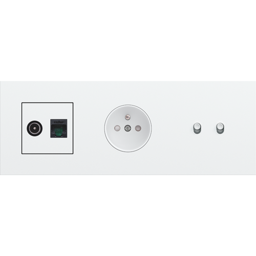 La plaque de recouvrement triple Niko Toggle, horizontale, s'enclenche sur une fonction de 45 x 45 mm, une fonction de prise de courant et une fonction de commutation double that have been horizontally installed next to each other with a centre distance of 71 mm. La plaque de recouvrement se combine avec tout set de finition Niko 45 x 45 mm, set de finition pour prise de courant Niko Rocker et Niko Toggle et set Niko Toggle disponibles pour les fonctions de commutation simple. Elle se compose d'un cadre supérieur, d'un guide lumineux et d'un cadre inférieur qui sont interconnectés mécaniquement. Le cadre supérieur est en acier. Le cadre inférieur est en polycarbonate (PC) blanc + acrylique-styrène-acrylate (ASA), white coated. L'épaisseur du cadre supérieur est de 2 mm, celle du cadre inférieur de 6 mm.
