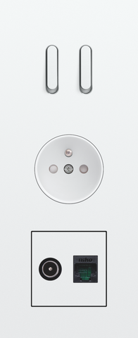 La plaque de recouvrement triple Niko Rocker, verticale, s'enclenche sur une fonction de commutation double, de prise de courant et une fonction de 45 x 45 mm qui ont été installées verticalement les unes au dessus des autres avec un entraxe de 60 mm. La plaque de recouvrement se combine avec toute barre Niko Rocker disponible pour la fonction de commutation double, le set de finition pour prise de courant Niko Rocker et Niko Toggle ainsi que set de finition Niko 45 x 45 mm. Elle se compose d'un cadre supérieur, d'un guide lumineux et d'un cadre inférieur qui sont interconnectés mécaniquement. Le cadre supérieur est en acier. Le cadre inférieur est en polycarbonate (PC) blanc + acrylique-styrène-acrylate (ASA), white coated. L'épaisseur du cadre supérieur est de 2 mm, celle du cadre inférieur de 6 mm.