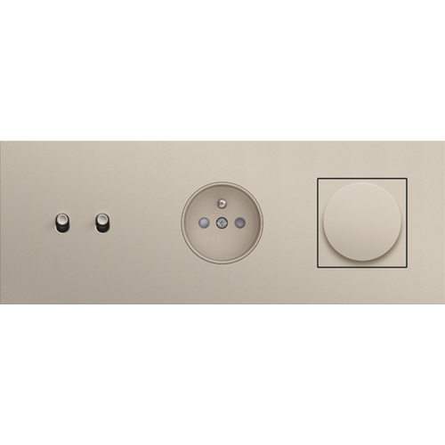 La plaque de recouvrement triple Niko Toggle, horizontale, s'enclenche sur une fonction de commutation double, de prise de courant et une fonction de 45 x 45 mm that have been horizontally installed next to each other with a centre distance of 71 mm. La plaque de recouvrement se combine avec toute barre Niko Toggle disponible pour la fonction de commutation double, le set de finition pour prise de courant Niko Rocker et Niko Toggle ainsi que set de finition Niko 45 x 45 mm. Elle se compose d'un cadre supérieur, d'un guide lumineux et d'un cadre inférieur qui sont interconnectés mécaniquement. Le cadre supérieur est en acier. Le cadre inférieur est en polycarbonate (PC) blanc + acrylique-styrène-acrylate (ASA), white coated. L'épaisseur du cadre supérieur est de 2 mm, celle du cadre inférieur de 6 mm.