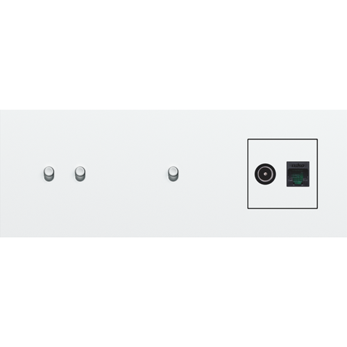 La plaque de recouvrement triple Niko Toggle, horizontale, s'enclenche sur une fonction de commutation double et une fonction de commutation simple et une fonction de 45 x 45 mm that have been horizontally installed next to each other with a centre distance of 71 mm. La plaque de recouvrement se combine avec toute barre Niko Toggle disponible pour les fonctions de commutation simple et double et set de finition Niko 45 x 45 mm. Elle se compose d'un cadre supérieur, d'un guide lumineux et d'un cadre inférieur qui sont interconnectés mécaniquement. Le cadre supérieur est en acier. Le cadre inférieur est en polycarbonate (PC) blanc + acrylique-styrène-acrylate (ASA), white coated. L'épaisseur du cadre supérieur est de 2 mm, celle du cadre inférieur de 6 mm.