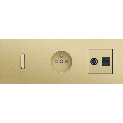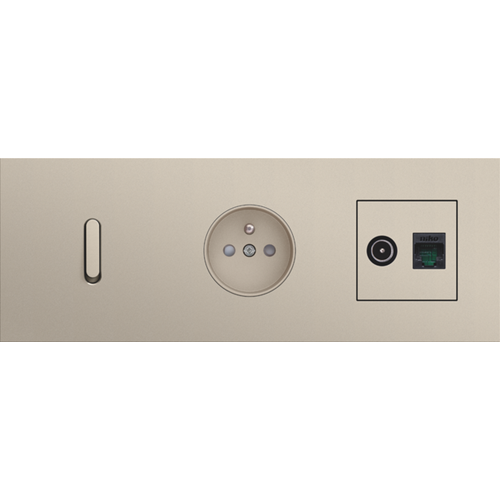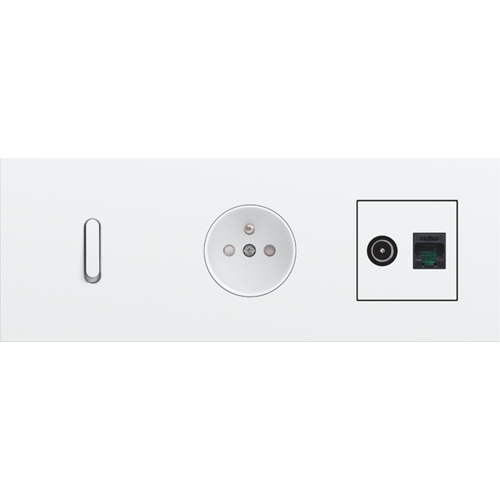 La plaque de recouvrement triple Niko Rocker, horizontale, s'enclenche sur une fonction de commutation simple, de prise de courant et une fonction de 45 x 45 mm that have been horizontally installed next to each other with a centre distance of 71 mm. La plaque de recouvrement se combine avec toute barre Niko Rocker disponible pour la fonction de commutation simple, le set de finition pour prise de courant Niko Rocker et Niko Toggle ainsi que set de finition Niko 45 x 45 mm. Elle se compose d'un cadre supérieur, d'un guide lumineux et d'un cadre inférieur qui sont interconnectés mécaniquement. Le cadre supérieur est en acier. Le cadre inférieur est en polycarbonate (PC) blanc + acrylique-styrène-acrylate (ASA), white coated. L'épaisseur du cadre supérieur est de 2 mm, celle du cadre inférieur de 6 mm.