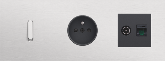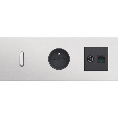 Set de finition pour prise de courant avec broche de terre et obturateurs de protection. Cette plaque centrale doit être utilisée avec une prise de courant d'une profondeur d'encastrement de 28,5 mm et une plaque de recouvrement de prise de courant Niko Rocker ou Niko Toggle. Le set de finition est doté d'une vis noire et d'obturateurs de protection noirs qui s'harmonisent avec le reste du set de finition. Couleur de finition: anthracite coated.