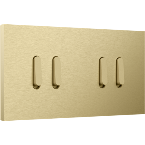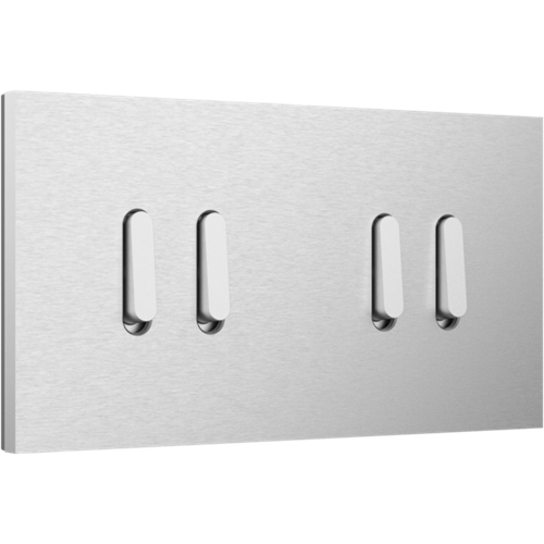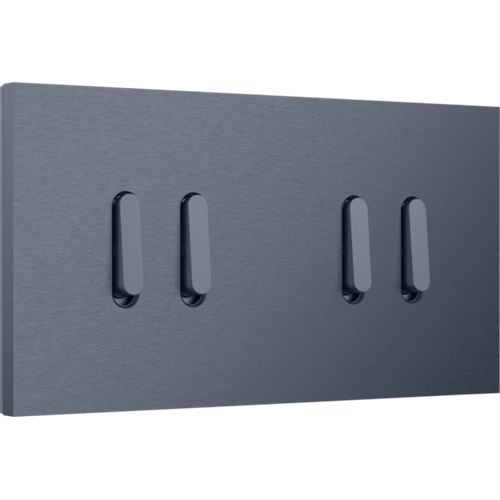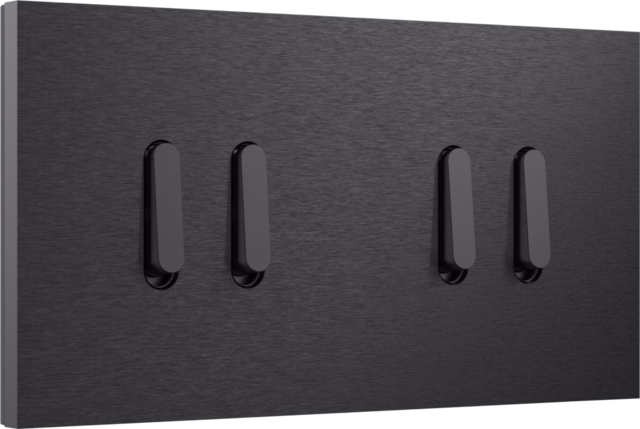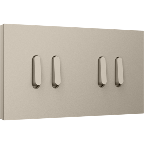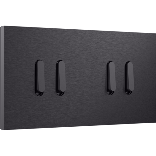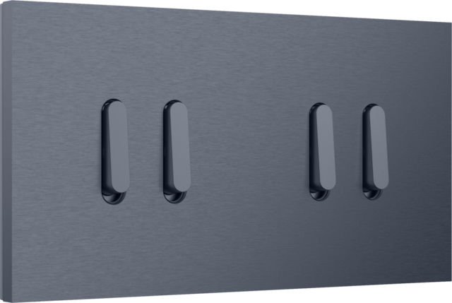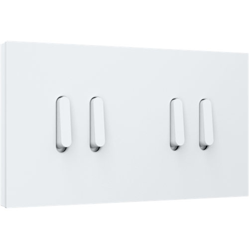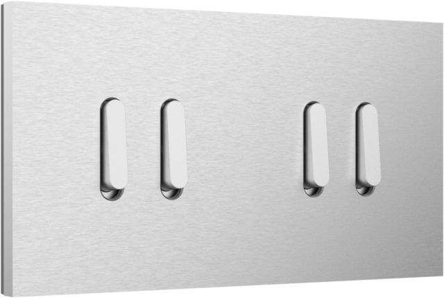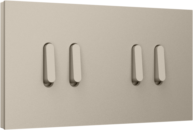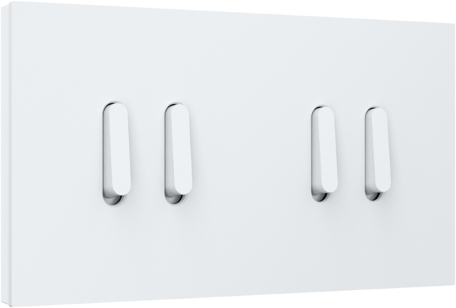 La plaque de recouvrement double Niko Rocker, à orientation horizontale, s'enclenche sur deux fonctions de commutation double qui ont été installées horizontalement les unes à côté des autres avec un entraxe de 71 mm. La plaque de recouvrement se combine avec toute barre Niko Rocker disponible pour les fonctions de commutation simple.