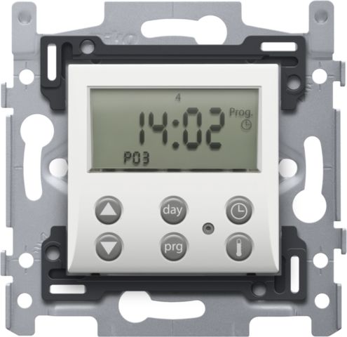 Le thermostat numérique avec réglage intelligent et contact de commutation 1 A règle la temperature de manière efficace. Il est équipé d'un programme journalier et hebdomadaire et d'une mémoire permanente. Il contient un set de finition et convient pour fixation fixation par vis. La plaque de recouvrement doit être commandée séparément. Couleur de finition: white coated.