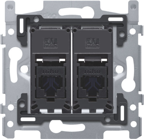 Ce mécanisme avec 2 prises RJ45 UTP Cat. 6, en modèle plat, sert à établir une connexion réseau avec 2 appareils pour des applications de téléphonie, Ethernet, IP ou internet. Le mécanisme est connecté en étoile sur l’armoire de connexion centrale à l’aide d’un câble du même type de performance. Les dimensions intérieures du socle sont de 45 x 45 mm et ses dimensions extérieures de 60 x 71 mm et il est doté de fixation par vis. Un set de finition d’une couleur au choix doit être commandé séparément.