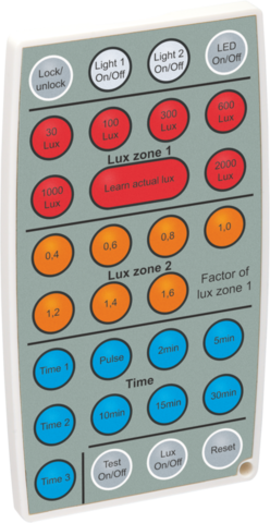 Cette télécommande convient pour régler par infrarouge le détecteur de présence à encastrer. Les réglages d’usine peuvent ainsi être modifiés, notamment le facteur de lumière du jour (valeur lux) et la durée pendant laquelle la lumière reste allumée.