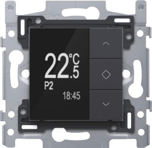 Vous installez le thermostat dans toute pièce où se trouve un chauffage par le sol, un radiateur, une unité de chauffage ou une installation de refroidissement. Le thermostat commande le chauffage ou le refroidissement de la pièce où il est installé. Vous combinez le thermostat à un module de chauffage ou de refroidissement. Dans Niko Home Control II, vous pouvez également le connecter à un module de commutation triple ou sextuple, pour la commutation d'un chauffage électrique. Comme Niko Home Control commande le chauffage ou le refroidissement dans les différentes pièces, l’habitant peut réaliser d’importantes économies d’énergie grâce à une connexion du thermostat, par exemple, avec la fonction éco (tout éteint) ou les fonctions commandées par le calendrier (contrairement à ce qu’il se passe lorsqu’une température fixe est maintenue au moyen de vannes thermostatiques, par exemple).