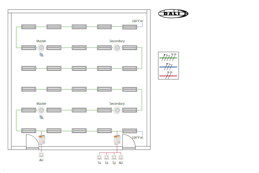 L'installation comporte une zone avec variation d'intensité manuelle plus scénarios fixes. Tous les luminaires sont équipés de pilotes DALI-2 conçus pour permettre la variation d'intensité.