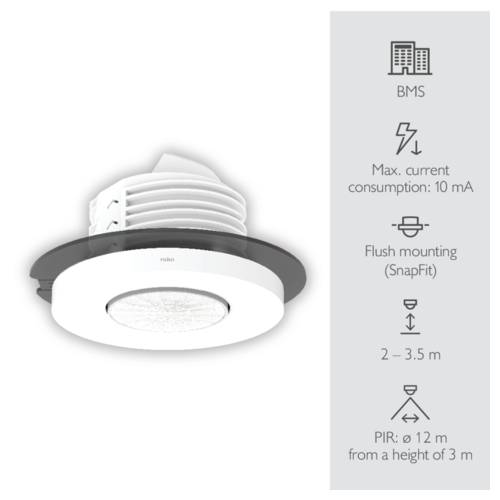 Ce détecteur de présence plat et discret est un maître DALI-2 pour la commande d'éclairage DALI dans un maximum de quatre zones. Le détecteur est muni de multiples fonctions et peut être commandé sans fil par boutons-poussoirs. L'étrier de montage SnapFit garantit un montage stable et rapide sur tous les types de faux plafonds avec ou sans dalles amovibles. Les zones d'éclairage sont définies lors de la mise en service à l'aide de l'appli Niko detector tool et d'une communication Bluetooth® bidirectionnelle entre un smartphone et le détecteur.